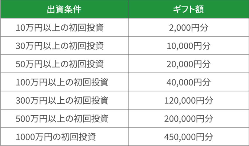 | 適用条件 | ①キャンペーン対象メディアから投資家登録を完了させる ②会員登録から60日以内に初回投資を50万円以上する(最大500万円以上の投資で48,000円分のアマギフプレゼント) |
